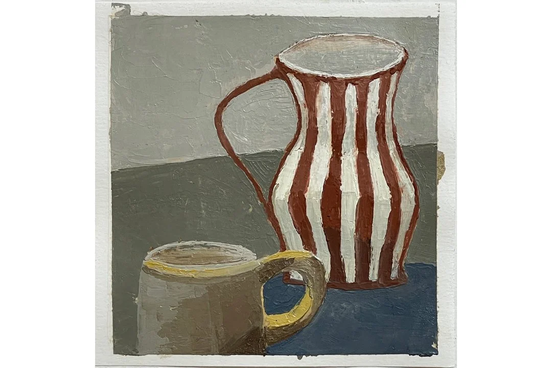 Caffè del Mattino (meaning Morning Coffee in Italian) is a fun still life I painted in Umbria, Italy. I really enjoyed how the stripes flowed down the coffee cup with the other cup being a more neutral palette. (2024).