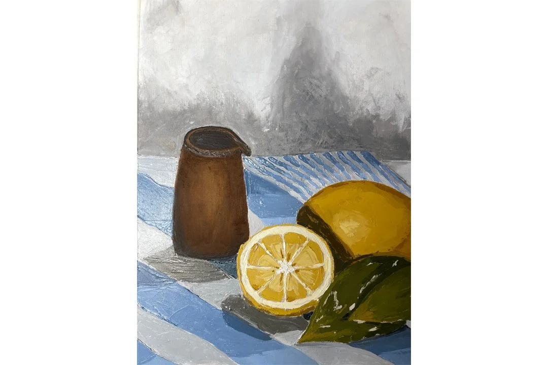 This was my final still life painting (painted from life using lemons from my backyard) from my second Limoni class with Lucy MacGillis. The paints that I used in this painting are all paints that I made using pigment powders from Zecchi and walnut oil. (2025).